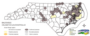 Abundant along the southeastern coast of the US. (Clark 1987). In North Carolina active eagle territories are known in the piedmont, sandhills, and along the coast (Foushee 1998). Bald eagles are usually found near water, i.e. lakes, reservoirs, large ponds, salt- and freshwater marshes, shorelines, etc. where an adequent supply fish can be found.